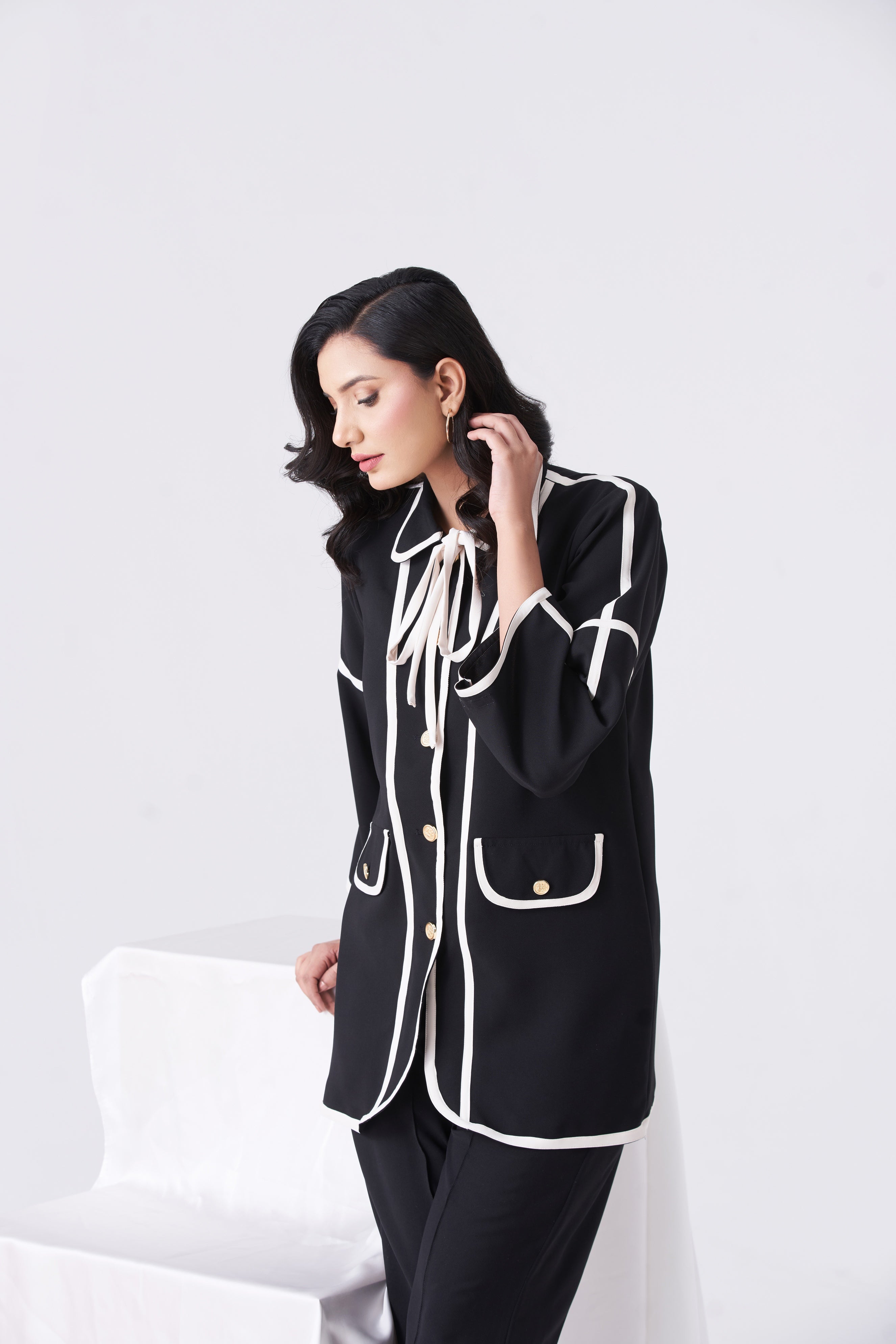 • Price mentioned includes two-piece co ord set comprising of button down top with piping details and matching trouser.