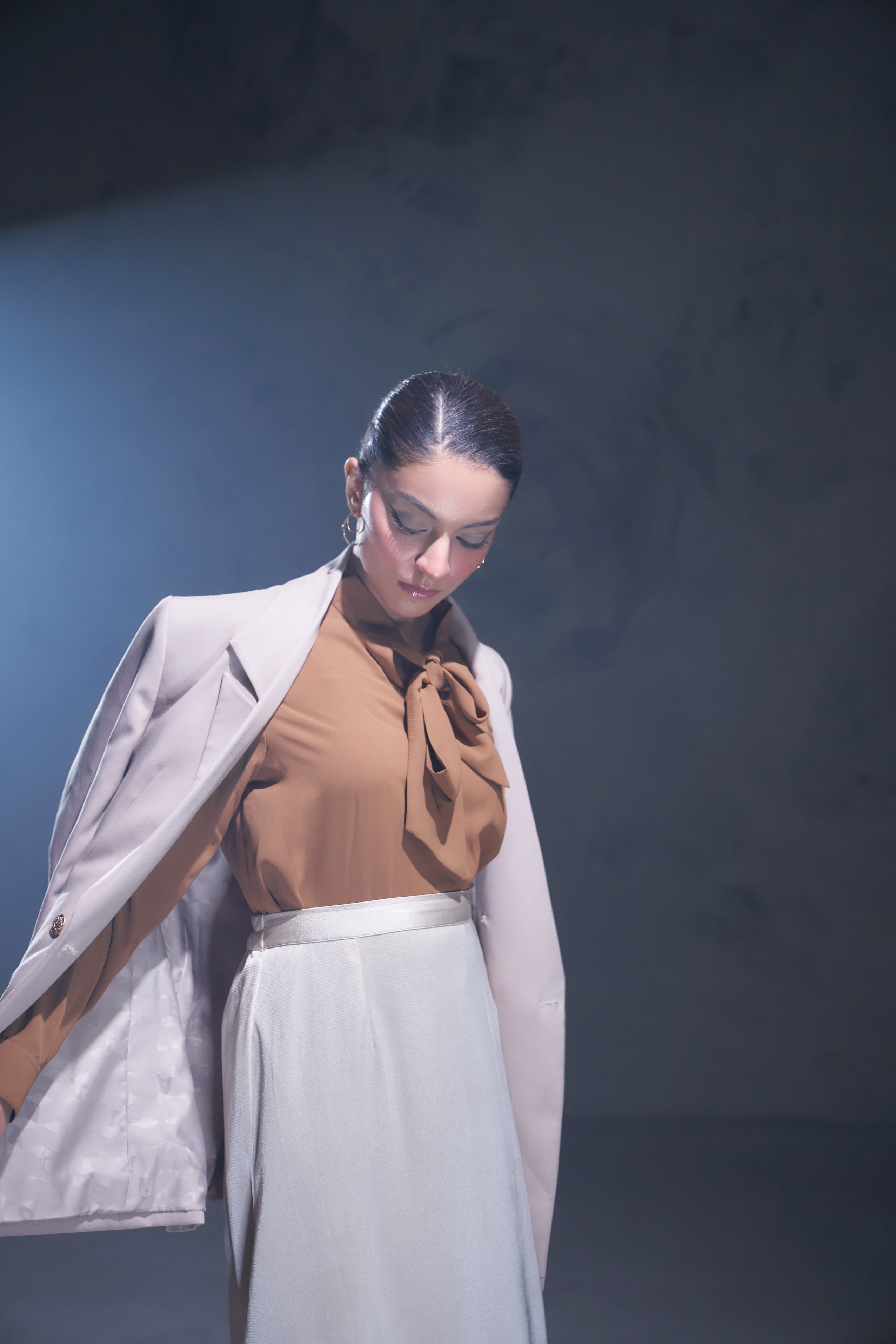 • Price mentioned includes three piece power dress comprising of high waist flared silk skirt, classic blazer and a bow tie blouse.